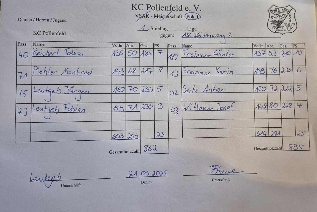 1 | So 21.09.2025 | 10:00 | KC Pollenfeld 2 | 1. Liga | 862 | 895 | ASC Weidenwang 2 | 1. Liga | https://www.vsak.de/wp-content/uploads/2025/09/IMG-20250921-WA0001.jpg |